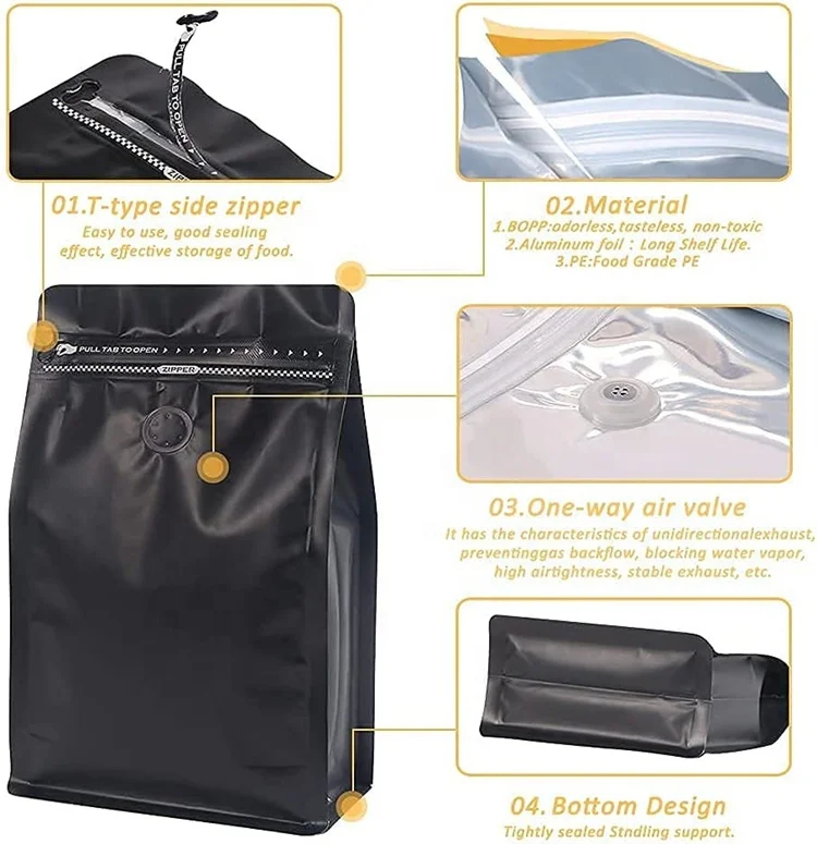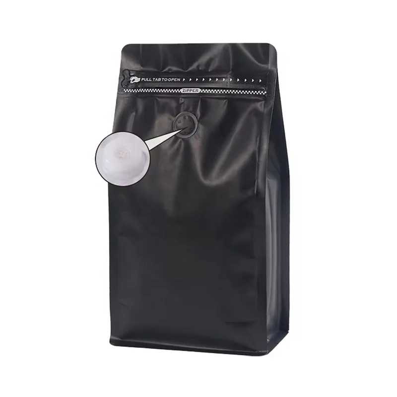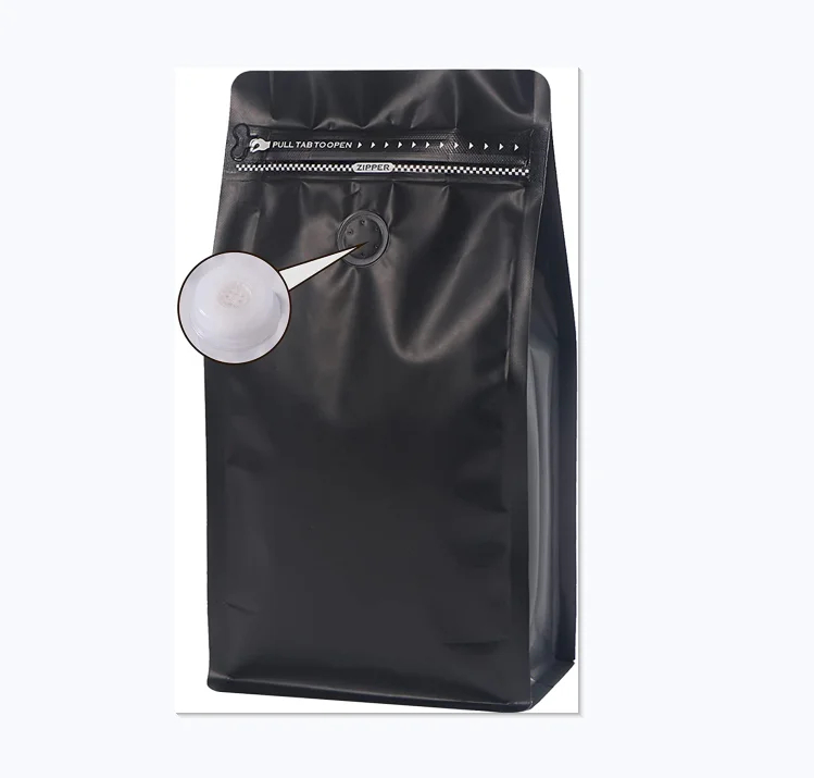 Custom Printed Plastic Coffee Bags with Valve Black High Barrier Aluminum Foil Flat Bottom Zipper Bag Coffee Beans Storage Bag
