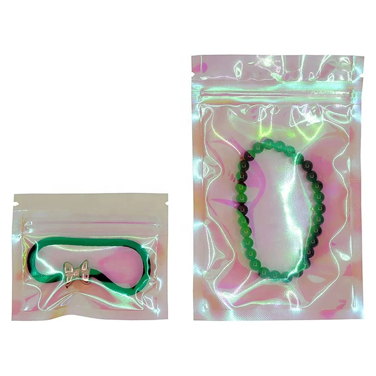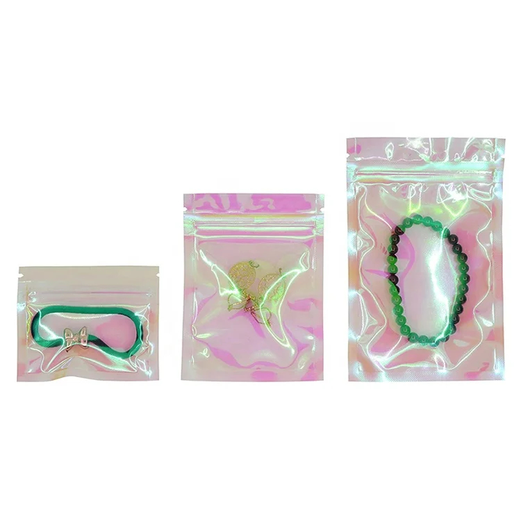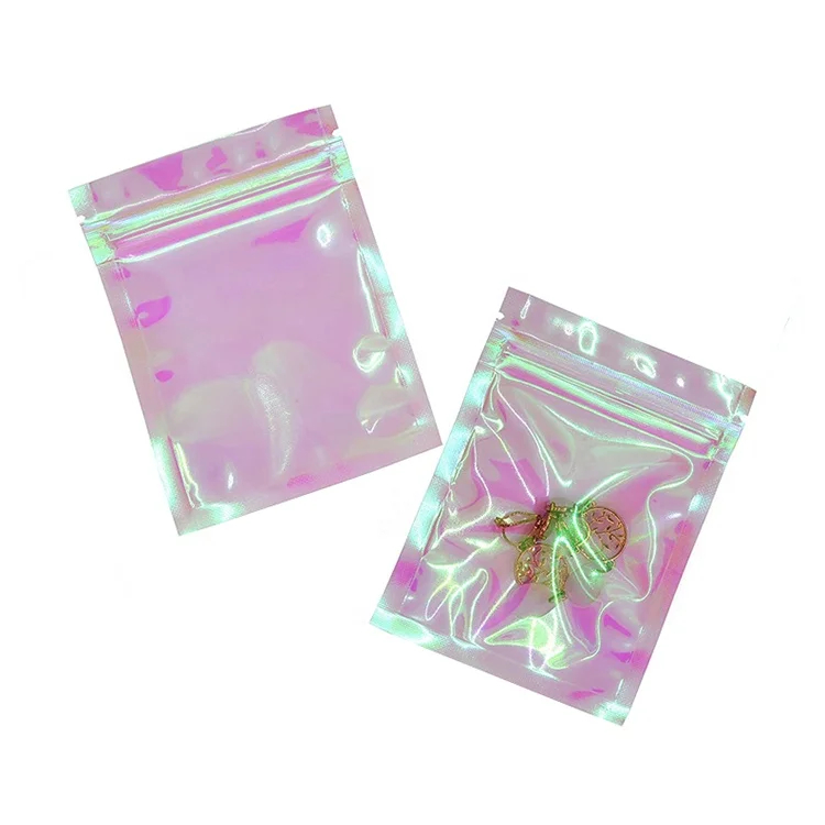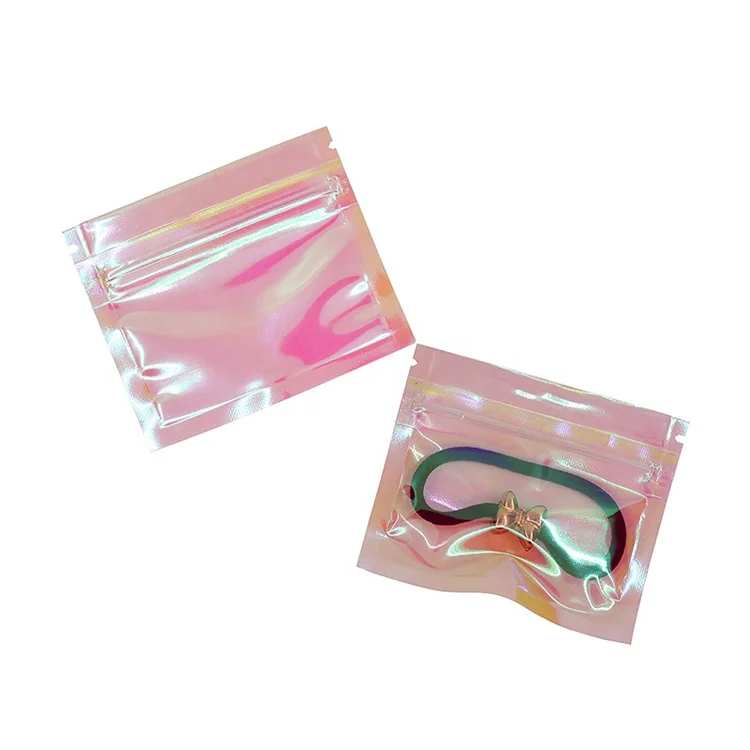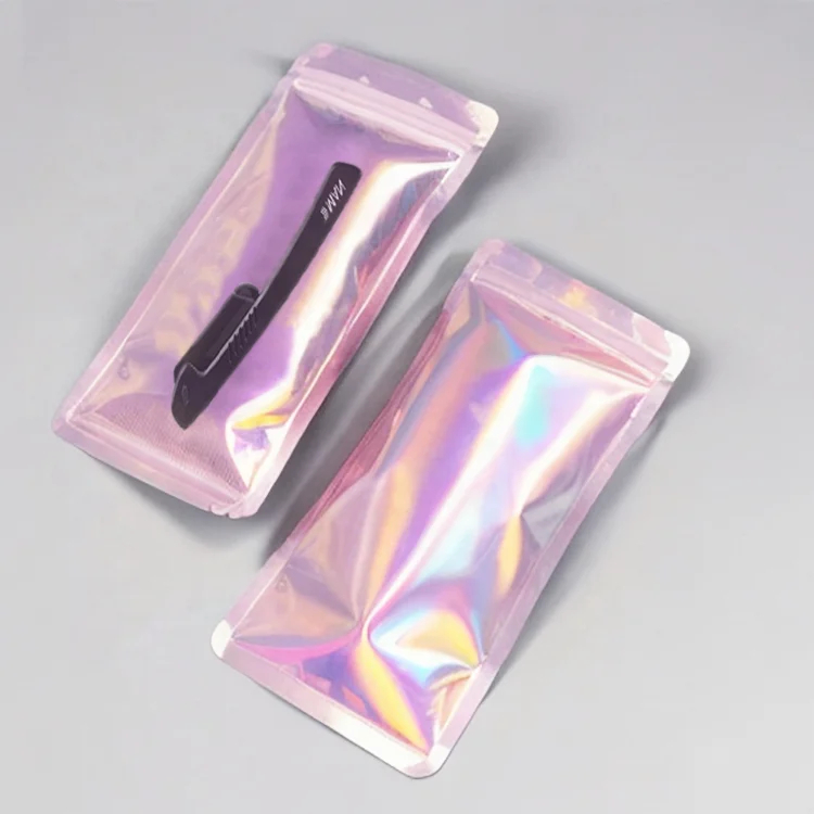 Custom Small Mylar Zip Lock Bag Holographic Plastic Baggies Pink and Clear Beauty Tools Packaging Plastic Hologram Ziplock Bag