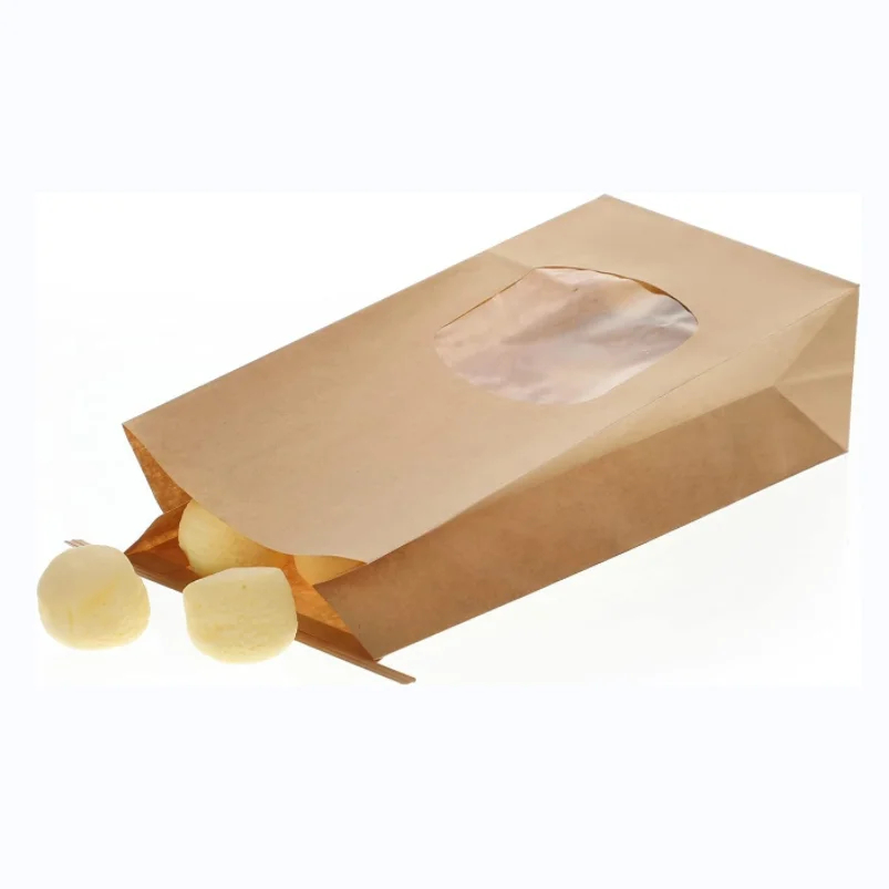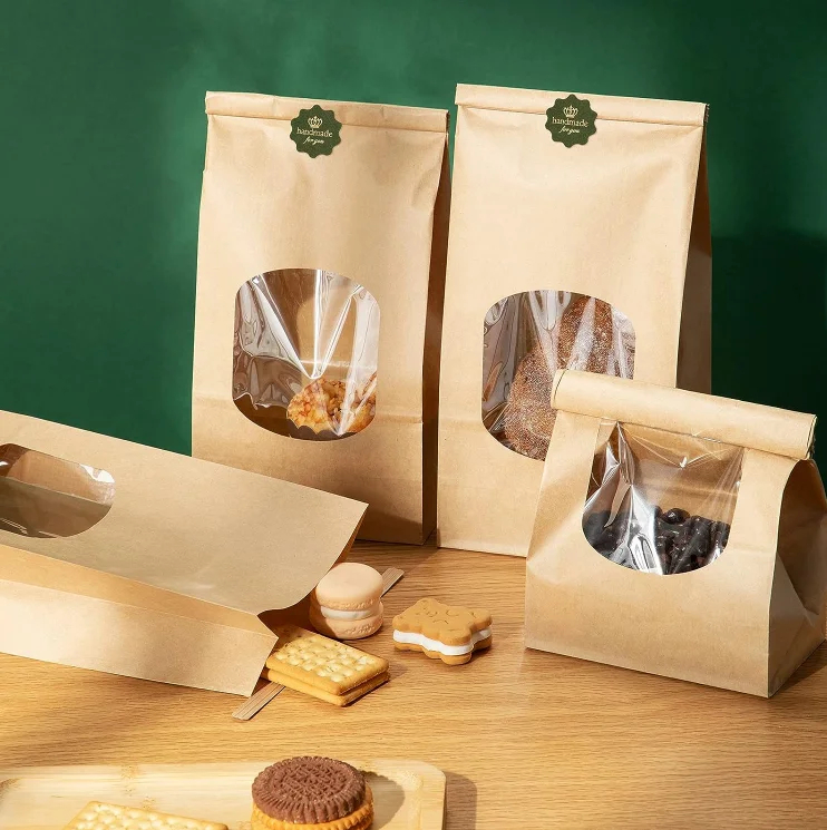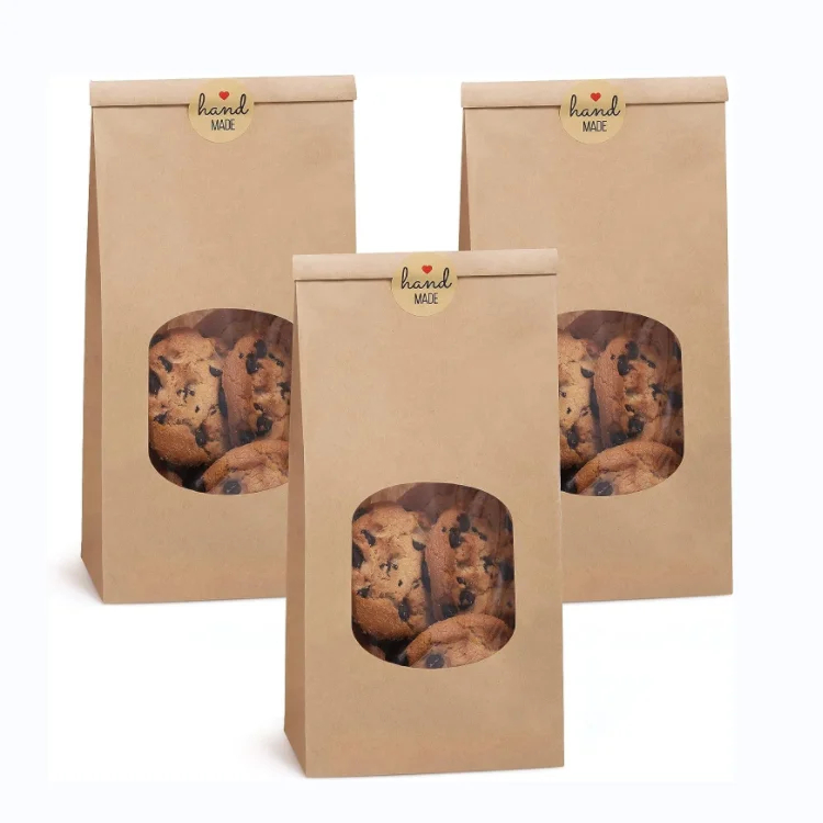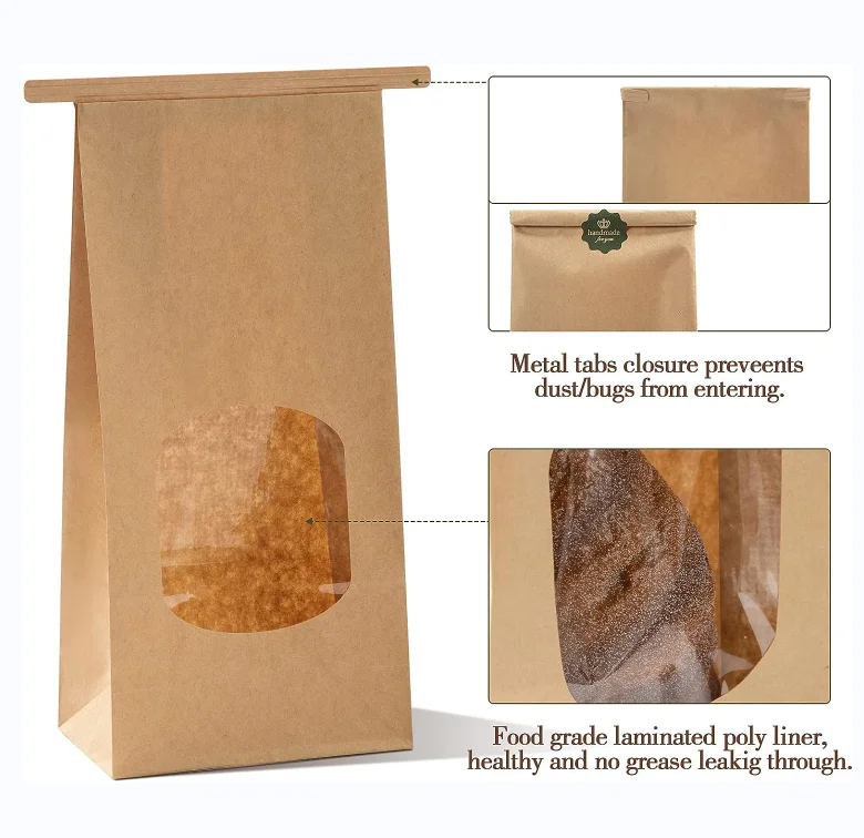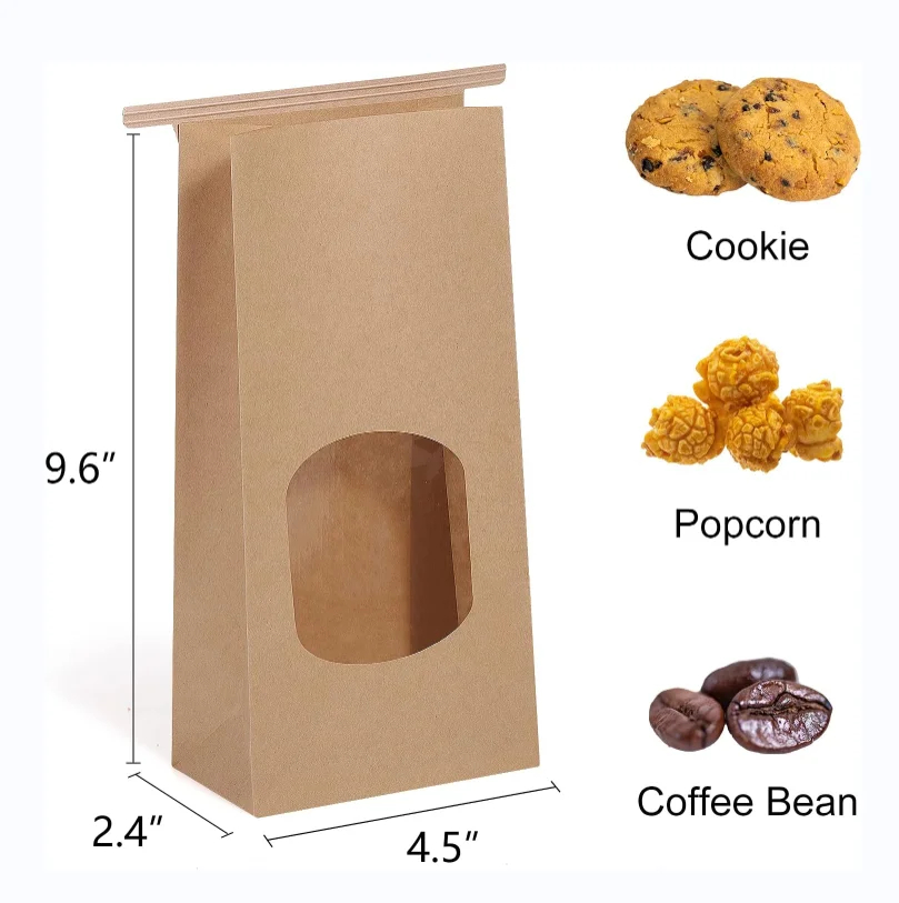 Customized Stand up Brown Kraft Paper Pouch with Window Tin Tie Lock Bag Coffee Bean Biscuit Cookies Loaf Bread Packaging Bag
