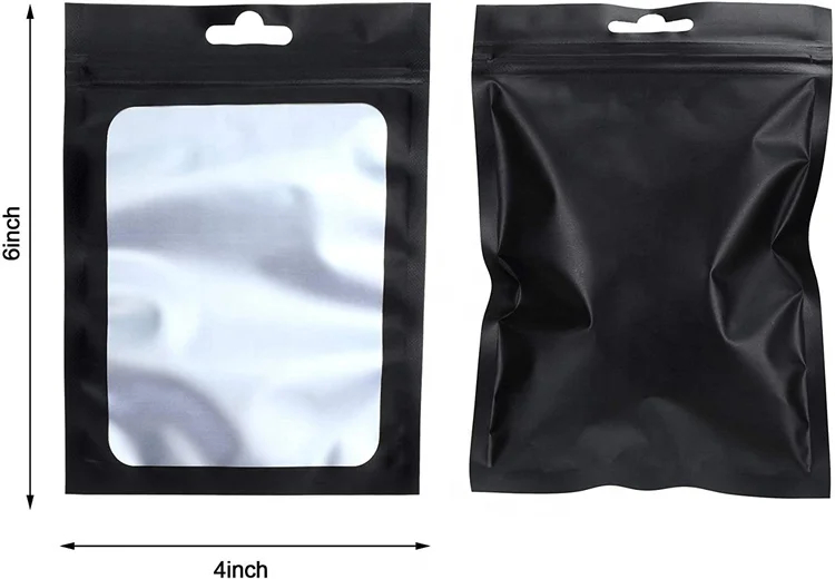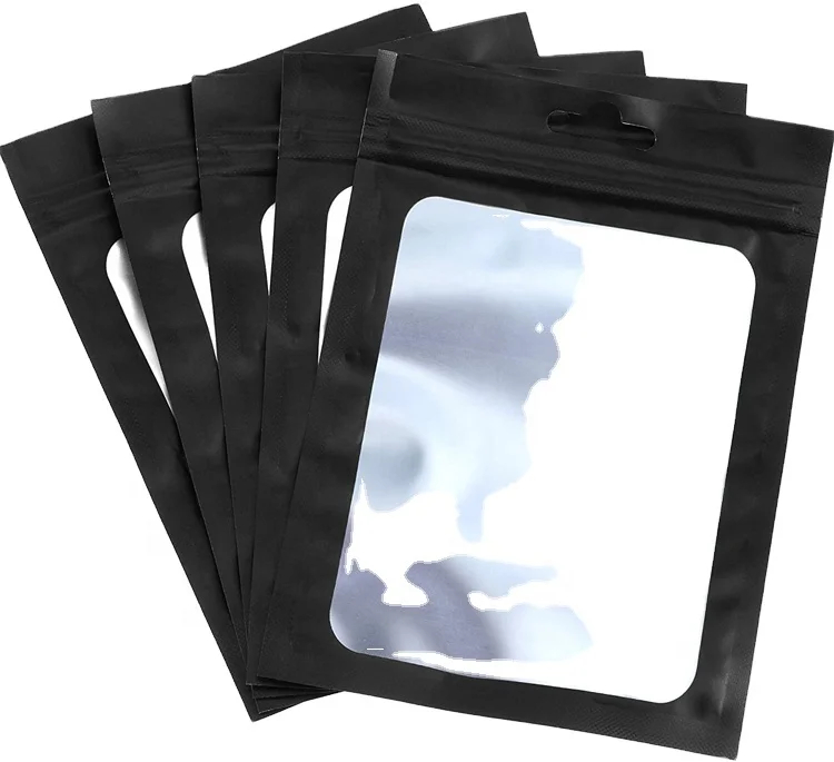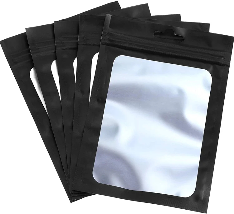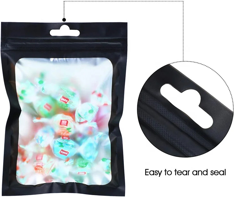 Resealable Smell Proof Matte Black Plastic Candy Packaging Bags with Clear Window Food Medicine Lip Gloss Jewelry Packaging Bag